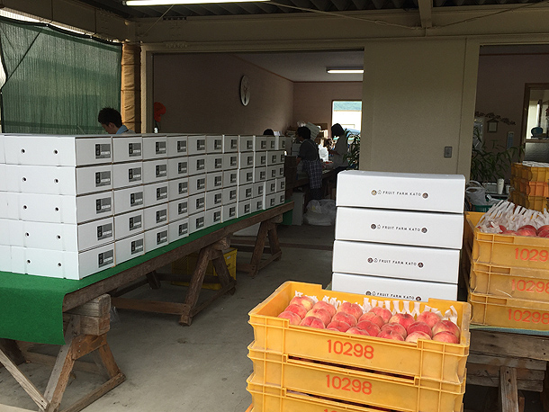 おじゃましたこの日 今月1日は 収穫初日。大忙し。発送用の箱がずらりと並びます。